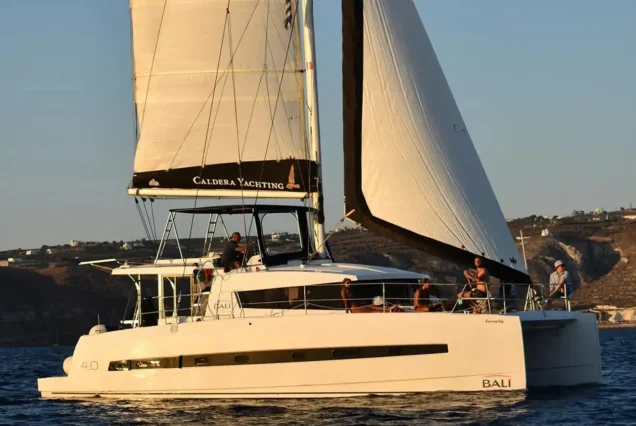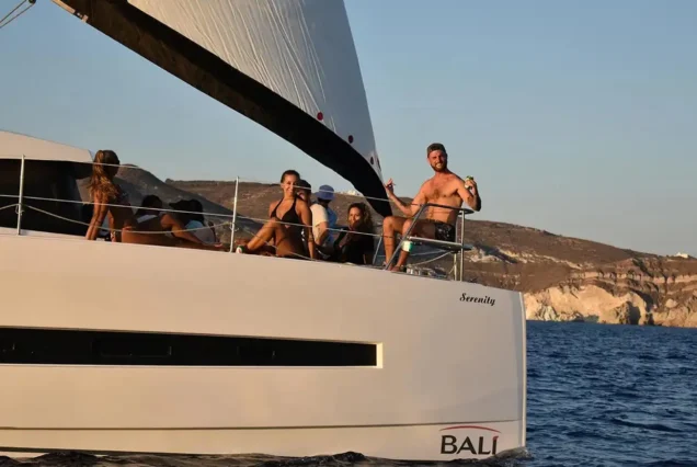 Set sail from the picturesque Marina of Vlychada and enjoy sailing along with the magnificent coastal scenery of Santorini. Your first photo shooting stop is at the Red Beach in Akrotiri, one of the most beautiful beaches of the island with the red rocks and the dark pebbles. Move on and reach the White Beach – accessible only by boat – and the Mesa Pigadia swimming spot and snorkel in the crystal clear blue waters with the rich underwater environment and reefs. Then sail past the Indian Rock, the Venetian Light House of Akrotiri. Pass by the Aspronisi Island and marvel at the glorious views of the Caldera and the cliff-hanging white houses. Sail around the must-see Volcano coast and stop at its’ hot springs, where you can treat yourself to a natural spa in the thermal mixed volcanic mud waters. One more stop follows up, this time to a secluded private bay and plunge in the majestic waters as our attentive crew prepares for you a delicious meal.  At the end of this unique sailing experience, we head back to the Marina of Vlychada.