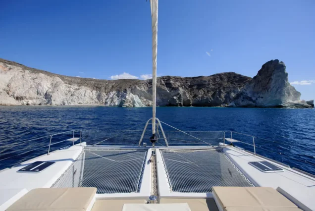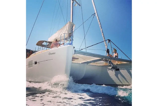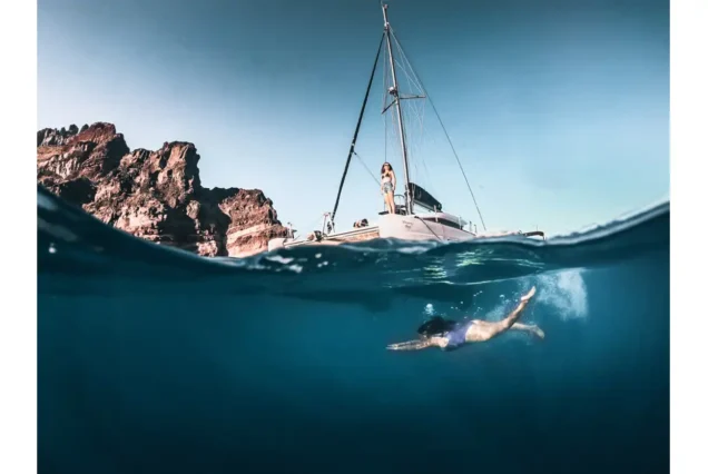 Begin your trip from the picturesque Ammoudi Bay, sail around the must-see Volcano coast and stop at its’ hot springs, where you can treat yourself to a natural spa in the thermal mixed volcanic mud waters. Move on and reach a secluded private bay and plunge in the majestic waters. Pass by the Aspronisi Island and marvel at the glorious views of the Caldera and the cliff-hanging white houses. Then sail past the Venetian Light House of Akrotiri and the Indian Rock. Continue to the White Beach – accessible only by boat – and the Mesa Pigadia swimming spot and snorkel in the crystal clear blue waters with the rich underwater environment and reefs, as our attentive crew prepares for you a delicious meal. Your last photo shooting stop is at the Red Beach in Akrotiri, one of the most beautiful beaches of the island with the red rocks and the dark pebbles. This unique sailing experience ends at the Marina of Vlychada.